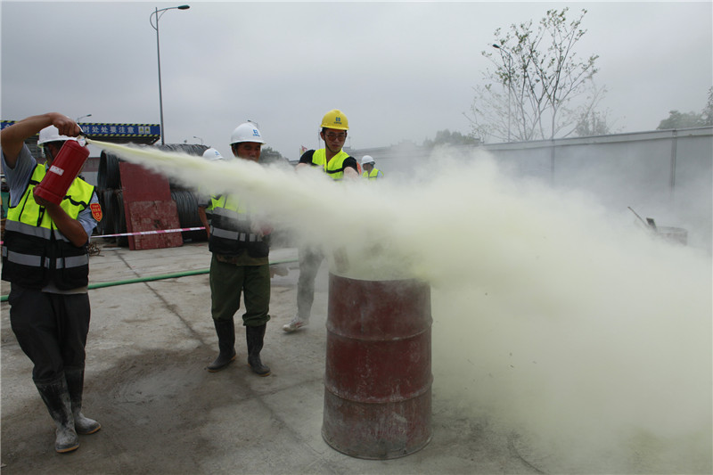 項目經(jīng)理對現(xiàn)場員工詳細講解了工地用電隱患、觸電急救步驟以及消防安全知識,例如易引發(fā)火災(zāi)的原因、火災(zāi)防范重點及防火措施、火災(zāi)撲救和現(xiàn)場逃生的方法等內(nèi)容,并對干粉滅火器、消防水帶的使用方法進行了實操示范。